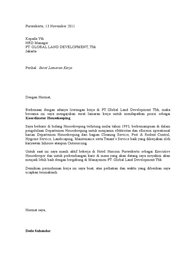 Contoh Surat Lamaran Kerja Di Hotel Bagian Housekeeping